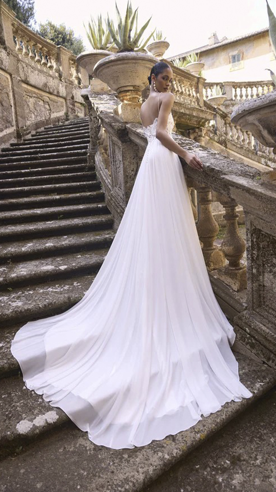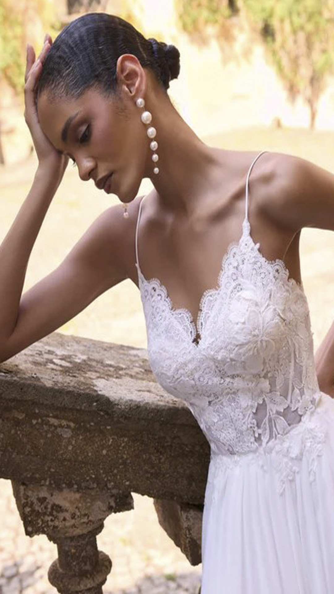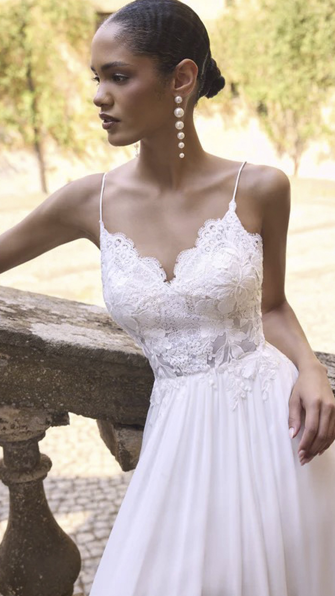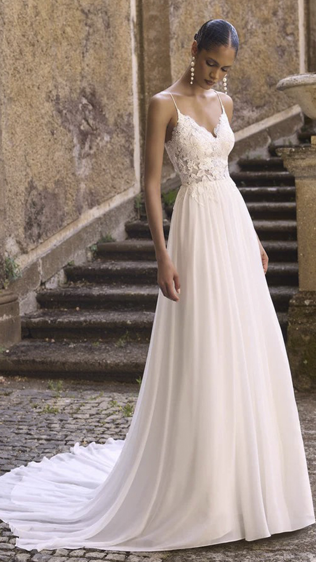 This boho inspired wedding dress features an elegant V-neckline supported by delicate spaghetti straps. The fitted bodice is adorned with intricate lace appliques that create a soft, romantic texture and trail subtly down the waistline.